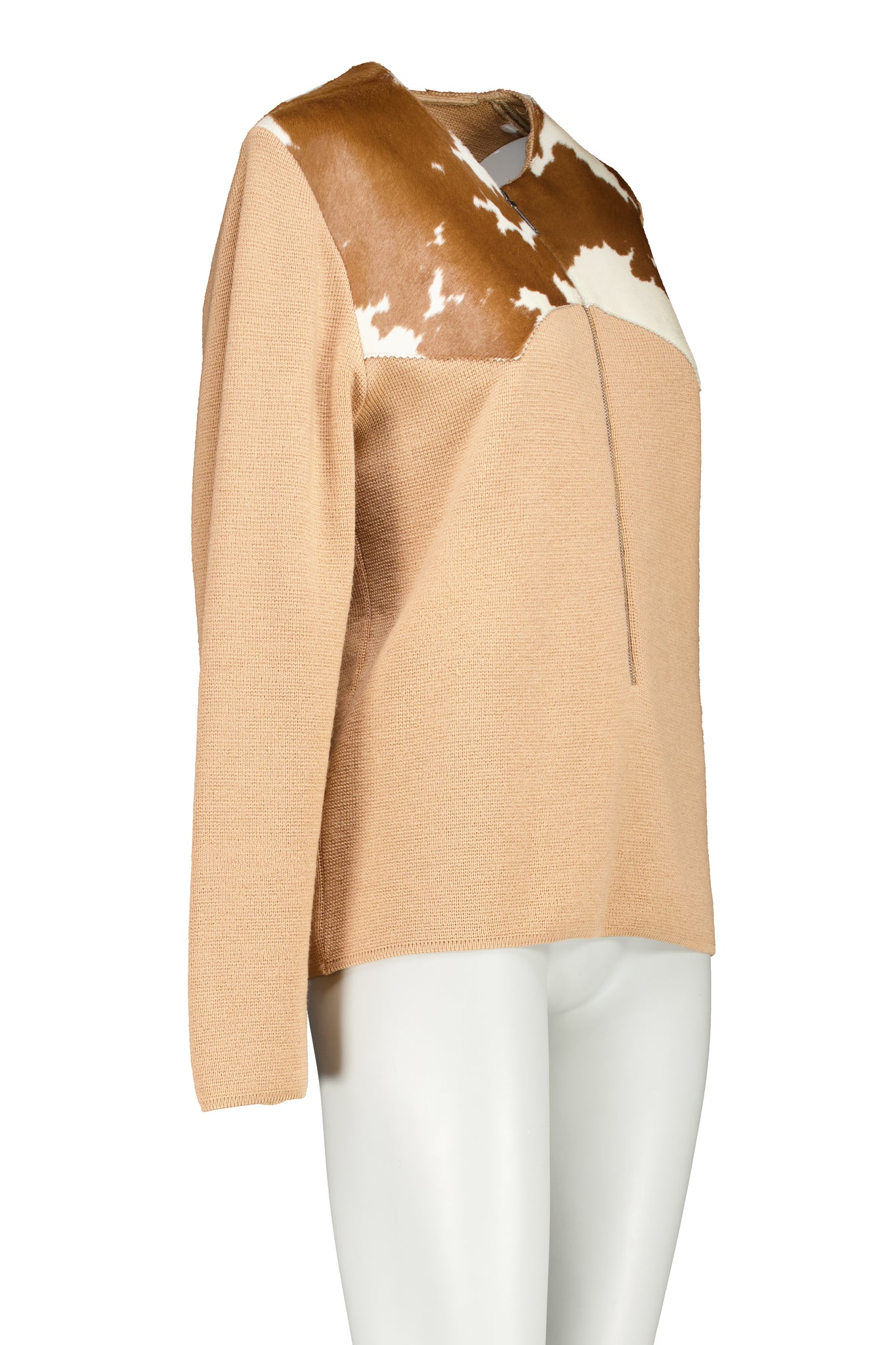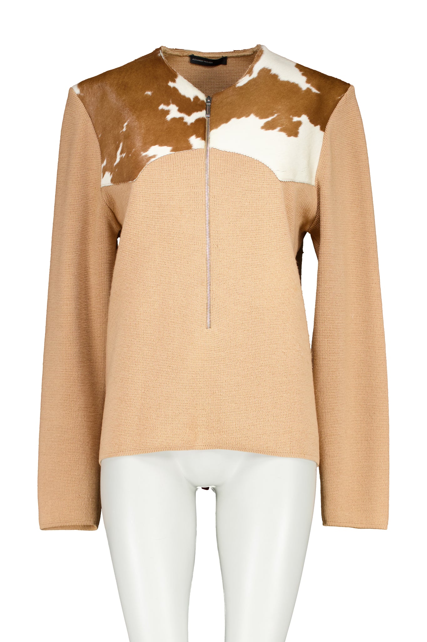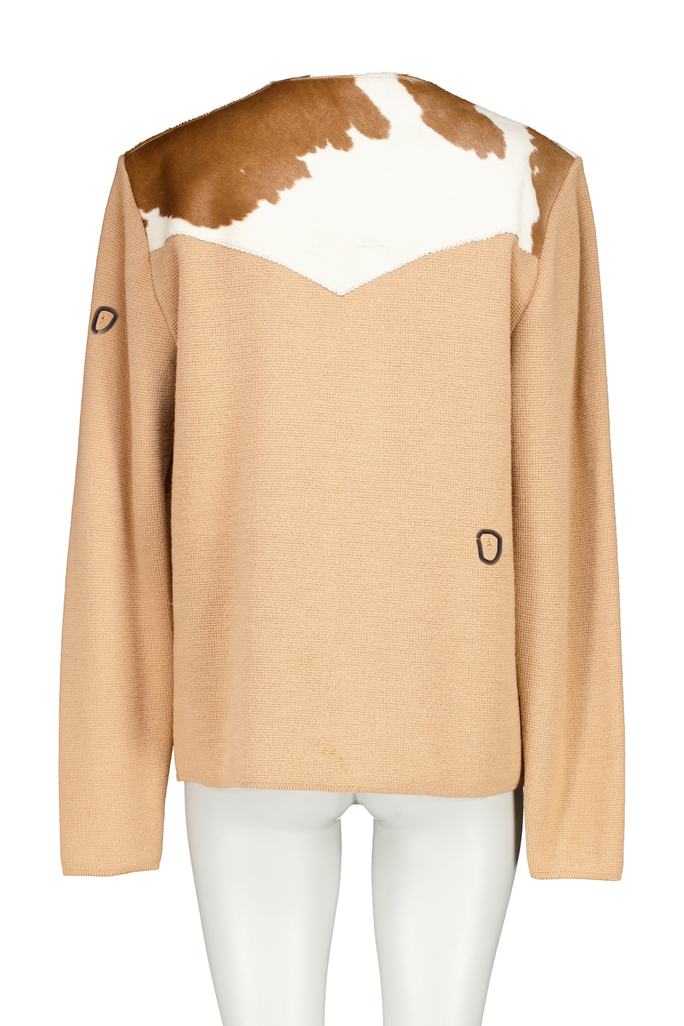 ALEXANDER MCQUEEN FALL WINTER 1997, "ITS A JUNGLE OUT THERE" COW HIDE RUNWAY SWEATER. THIS PIECE WAS PASSED ON TO ME FROM A CLIENT. THEY WERE COLLABORATORS OF MCQUEEN AND WAS GIFTEN THE PIECE. THE SWEATER WAS MODIFIED BY THE ORIGINAL MCQUEEN ATELIER TO HAVE NO COLLAR.
