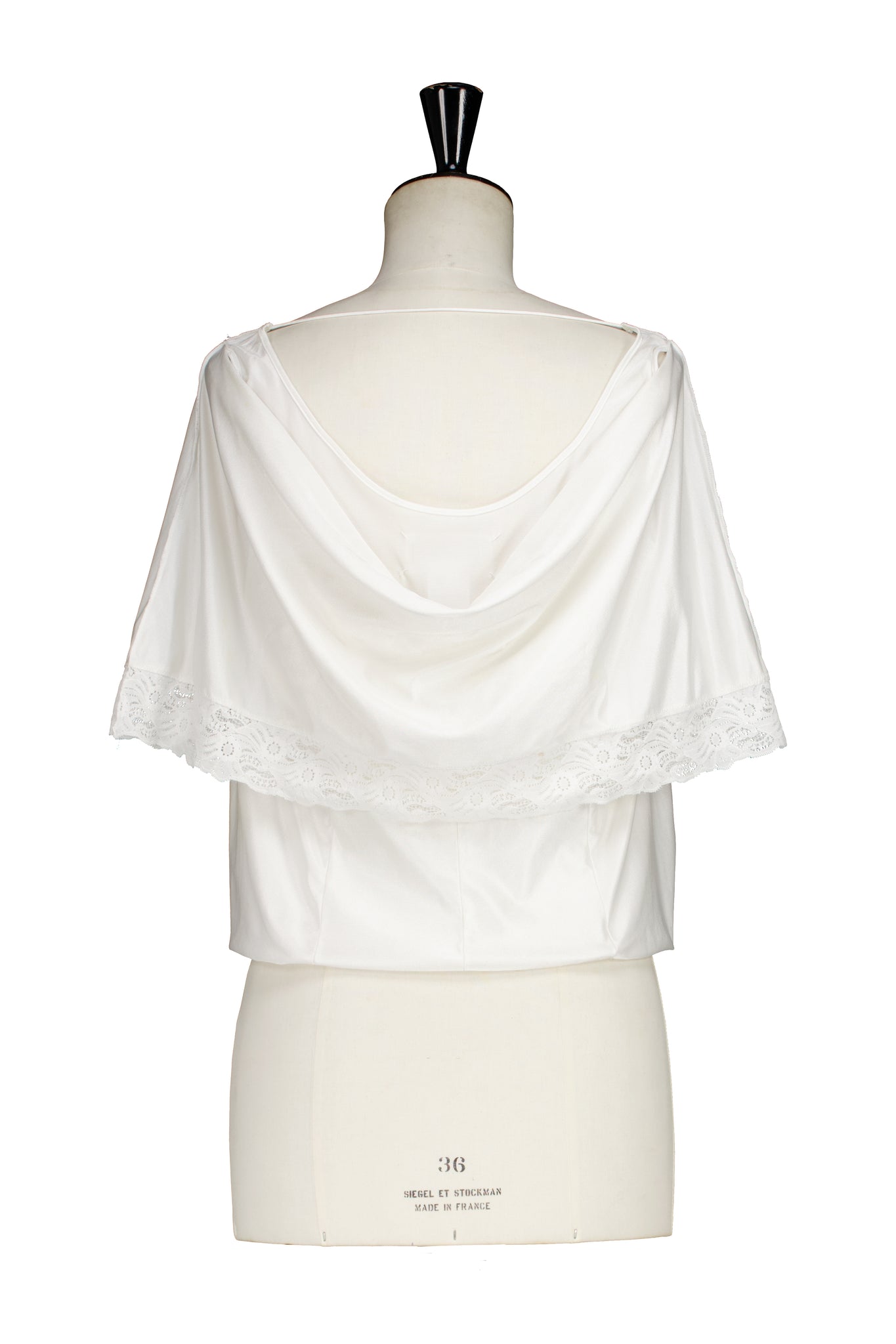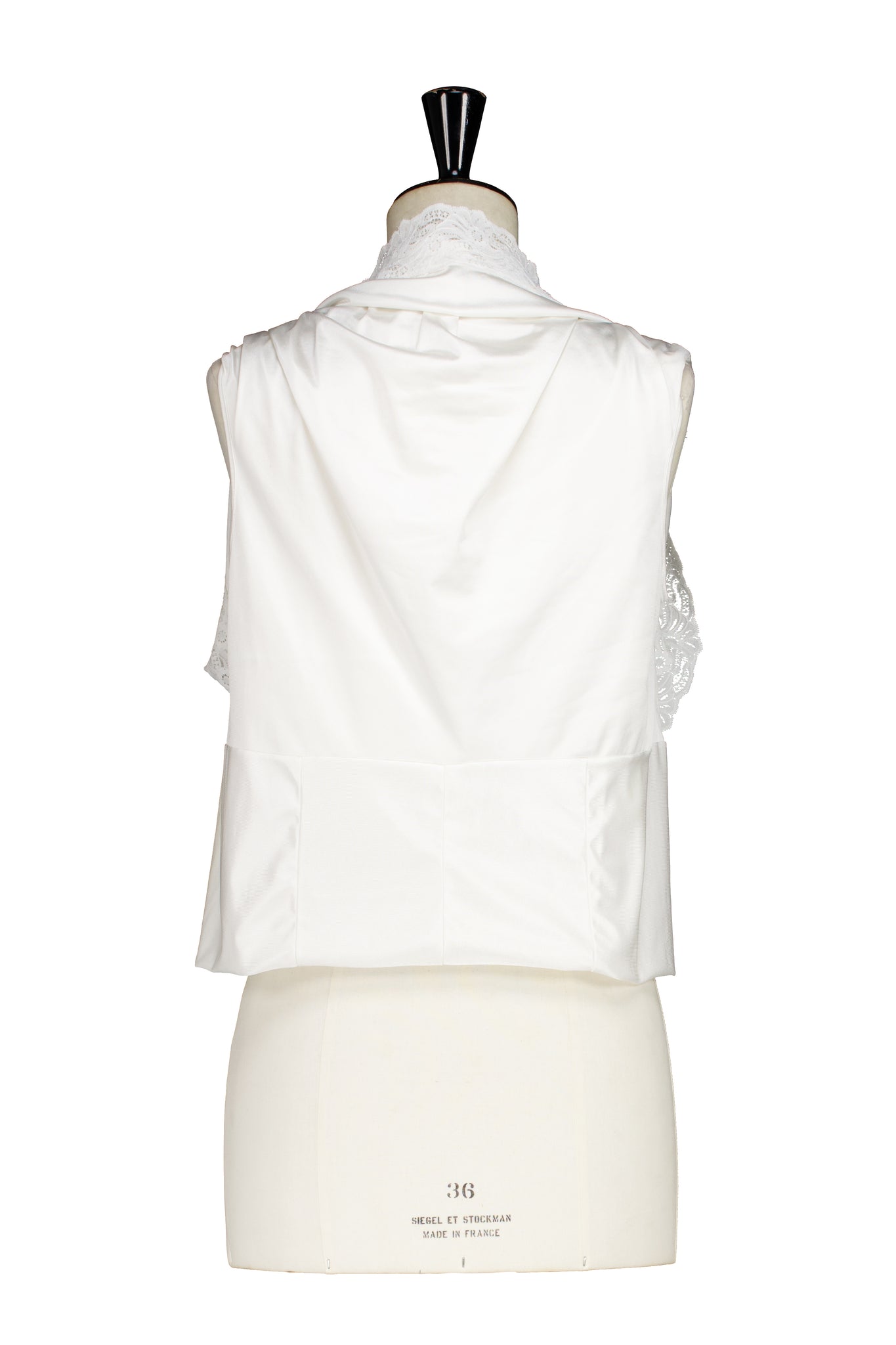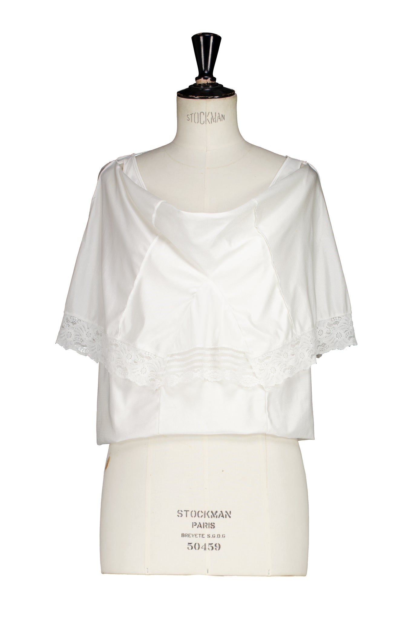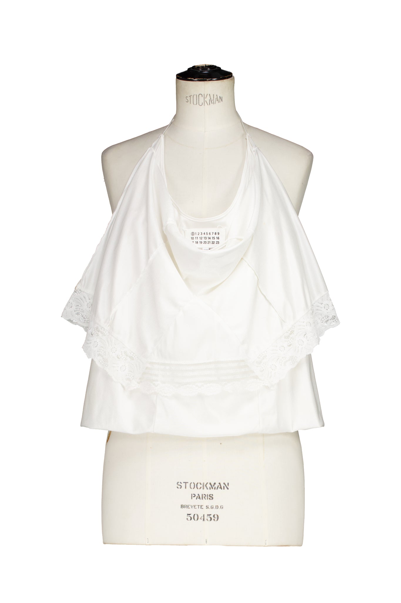 MAISON MARTIN MARGIELA ARTISANAL LACE TOP WITH CAPE FROM SPING SUMMER 2003. IN GOOD CONDITION SINCE IT'S WHITE. THERE ARE SEVERAL STAINS THROUGHOUT. DUE TO FIT OF PIECE THEY ARE NOT VERY NOTICEABLE PLEASE MESSAGE FOR MORE INFORMATION IF NEEDED.