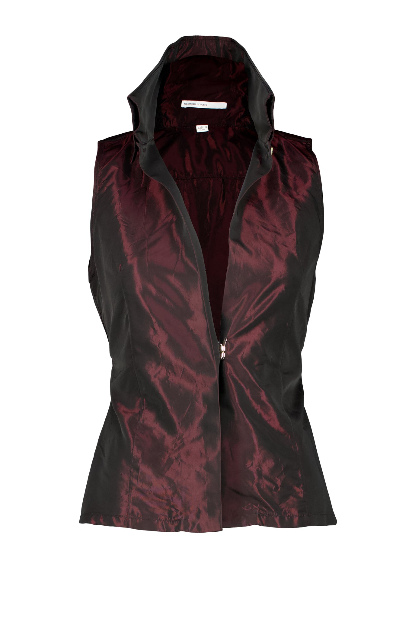 ALEXANDER MCQUEEN HIGH COLLAR CUT OFF SHIRT FROM “THE HUNGER”, SPRING SUMMER 1996 COLLECTION. THE SAME ONE WAS FEATURED IN ANOTHER COLOR WAY, THIS IS THE BEGINNING OF PRODUCTION YEAR, I IMAGINE MOST LOOKS AND PIECES WERE PRODUCED IN MANY COLORS. IN EXCELLENT CONDITION.