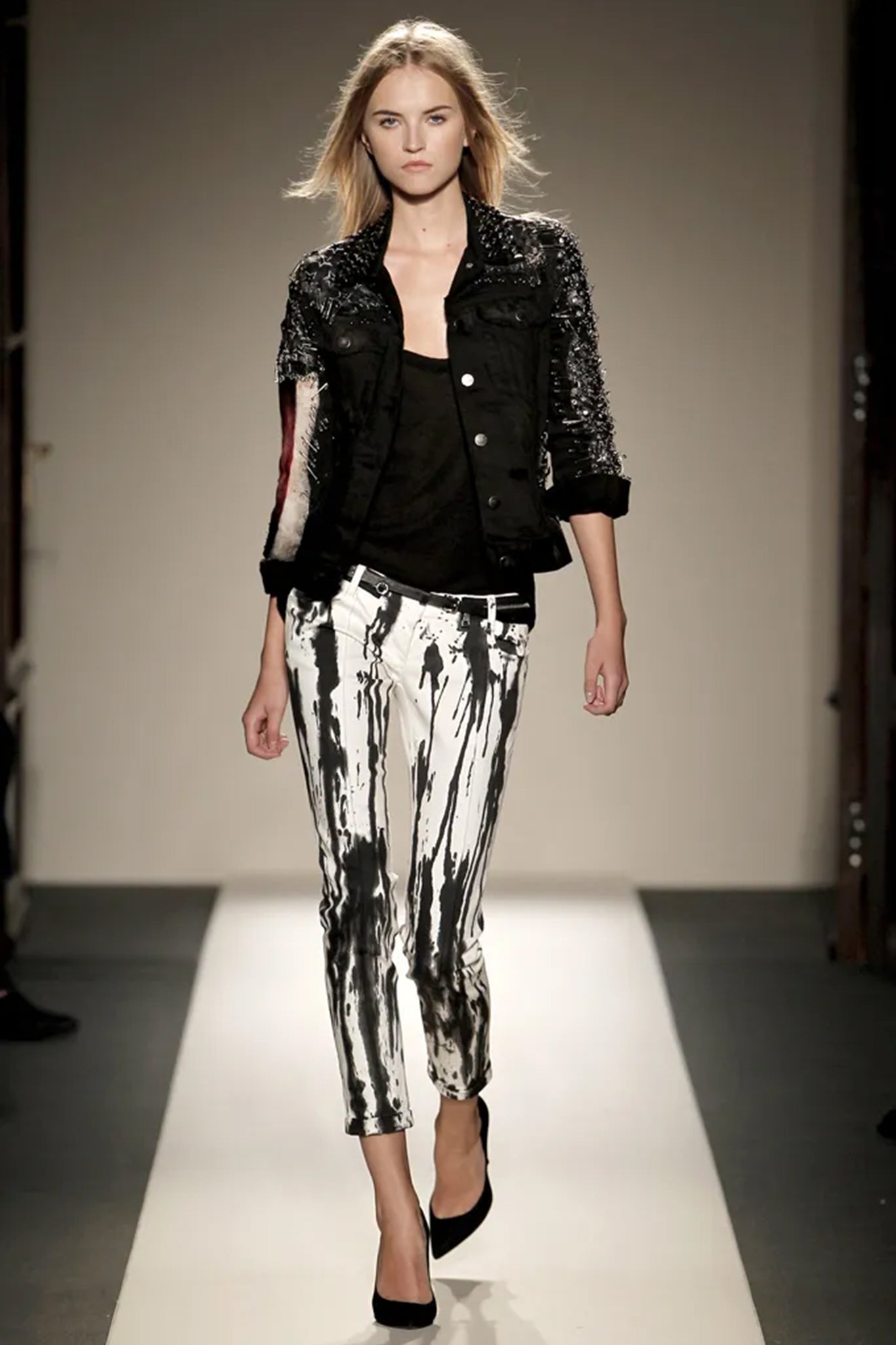 BALMAIN BY CHRISTOPHE DECARNIN SPRING SUMMER 2011 SPLATTER DENIM. FINALE LOOK. IN EXCELLENT CONDITION, SOME SMALL MARKS ON THE DENIM DUE TO WHITE COLOR AND AGE.