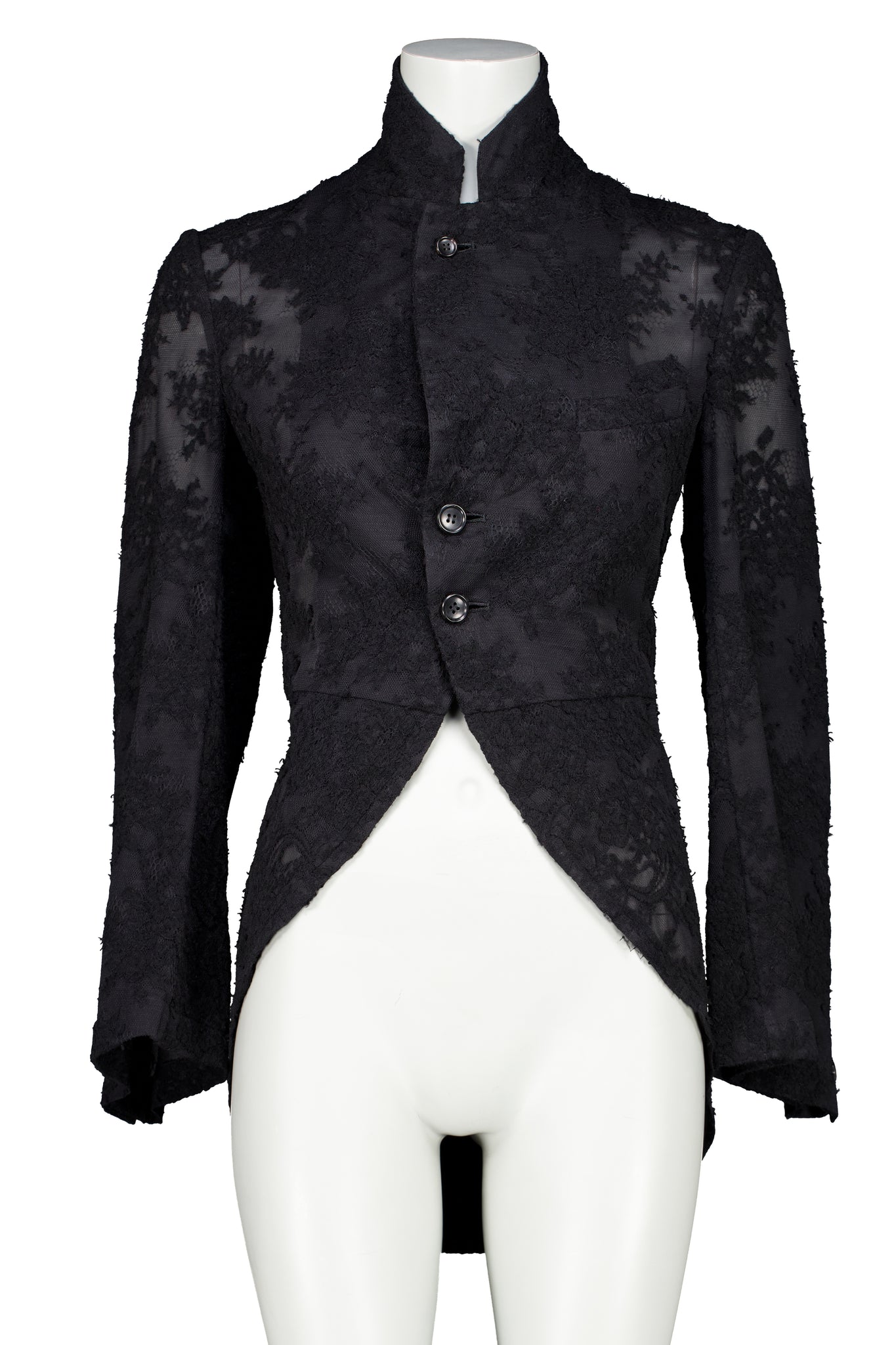 COMME DES GARÇONS “CEREMONY OF SEPARATION" LACE TAILCOAT FROM FALL WINTER 2015 COLLECTION. THIS PIECE TAKES INSPIRATION FROM THE LARGE LACE SCULPTURES ON THE RUNWAY. IN EXCELLENT CONDITION.