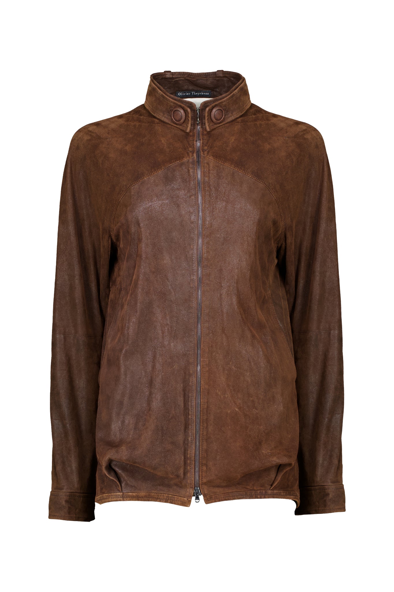 OLIVIER THEYSKENS FALL WINTER 2001, RUNWAY LEATHER JACKET. IN EXCELLENT CONDITION. YOU CAN WEAR THIS JACKET AS SEEN ON RUNWAY AND IMAGE 1, OR UNBUTTON THE SNAP SYSTEM ON THE SIDES AND WEAR NORMALLY.