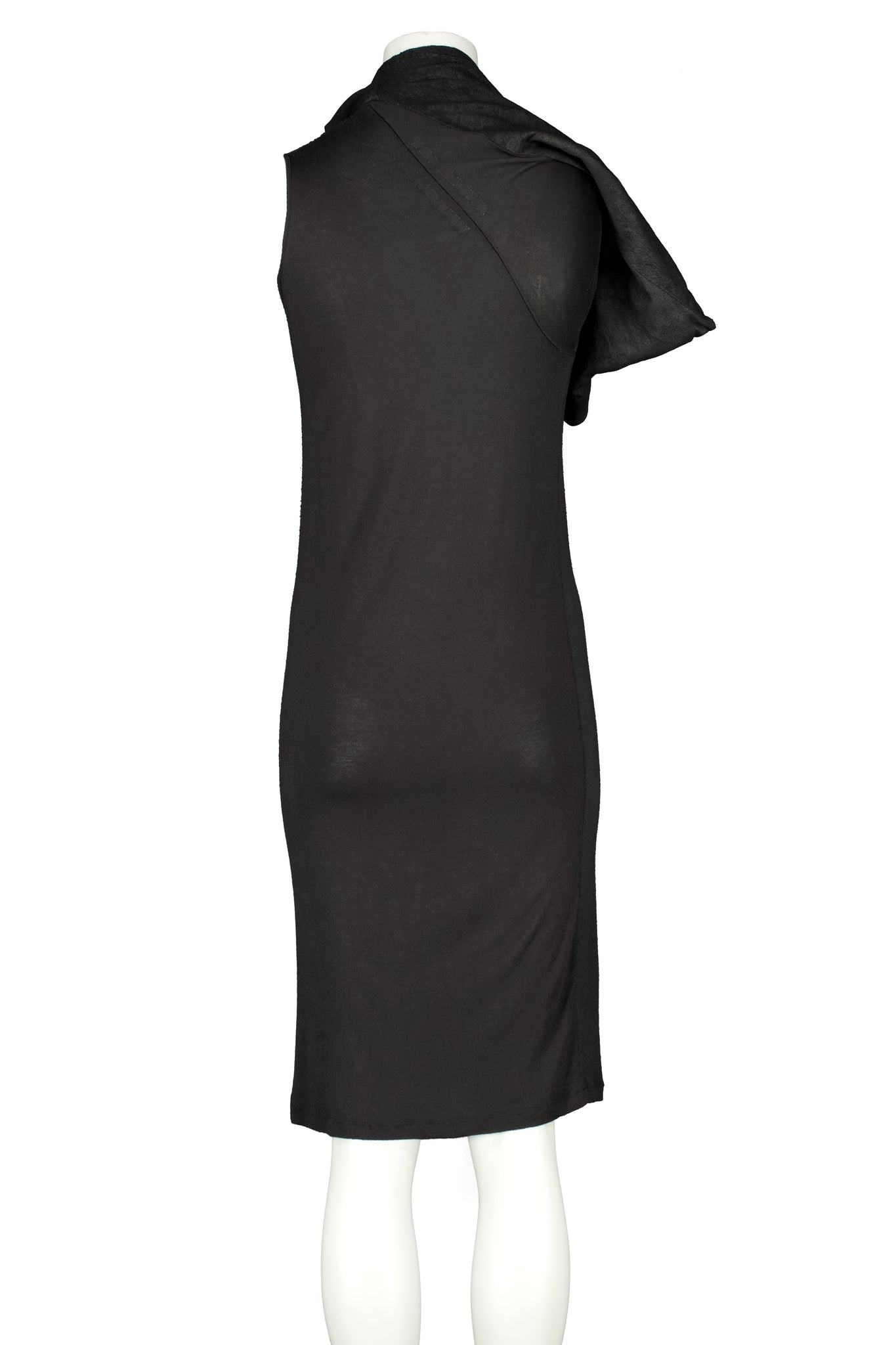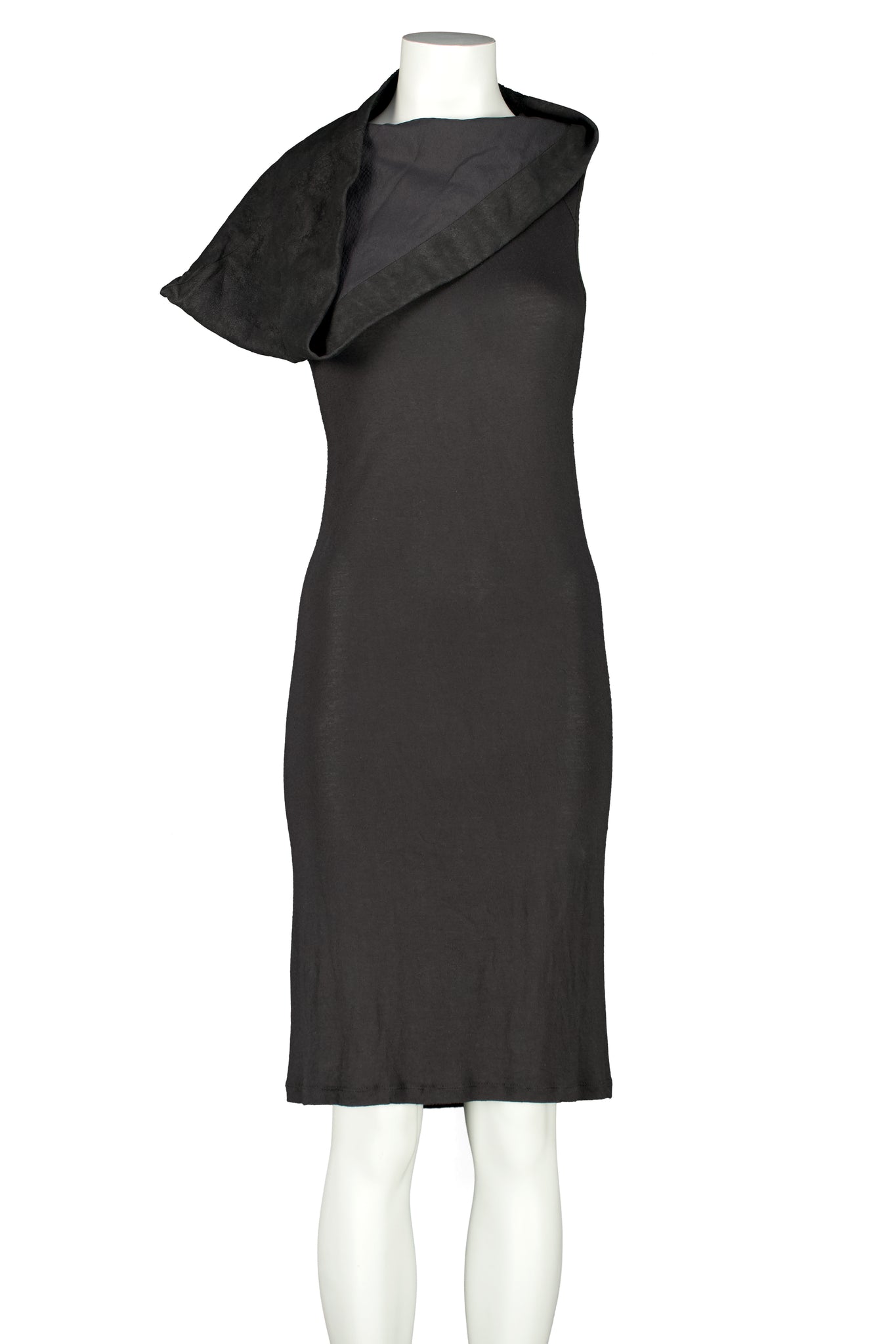 RICK OWENS SPRING SUMMER 2014 “VICIOUS” DRESS WITH LEATHER HOOD PANEL. IN EXCELLENT CONDITION. MISSING COMPOSITION LABEL.